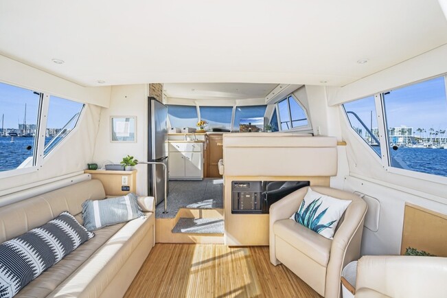 comfortable. Our yacht features four decks for entertaining: Interior & cockpit, flybridge, foredeck, and bow. Her expansive open cabin features large salon windows and plush seating in two separate interior areas. The dining area adjacent to the galley seats six for dinner.