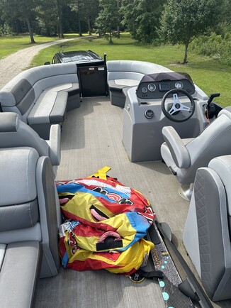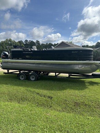 Like new 22’ Veranda pontoon with 115hp Yamaha motor, sun deck, tow bar, captains chairs, loungers, & bimi top